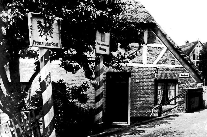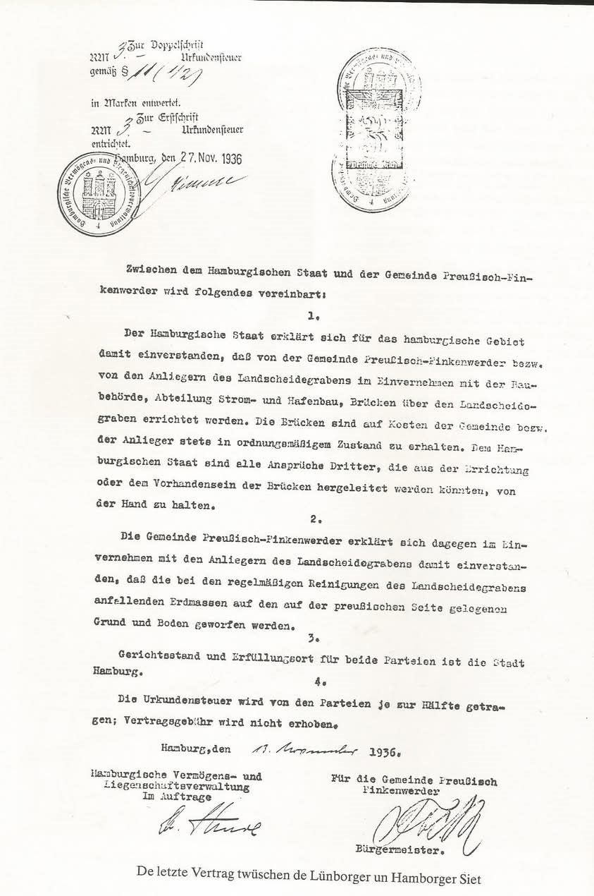 Oben auf der Abbildung ist die Elbe mit zwei waagerecht übereinander liegenden Inseln auf der linken Seite zu sehen, während auf der rechten Seite Hamburg noch als kleiner Fleck abgebildet ist. Die obere kleinere Insel gehörte einem Herrscher, der auf der nördlichen Seite der Elbe seinen Thron hatte und der sie, die Insel, irgendwann, als Hamburg erwachsen geworden war, wegen irgendwelcher Schulden an Hamburg abgeben musste. Die untere Insel gehörte unter Anderem mal zu Preußen und auch mal zu irgendeinem Fürsten, der auch etwas mit Lüneburg zu tun hatte. Mit der Zeit sind sich diese beiden Inseln immer näher gekommen, wobei der Wasserarm immer schmaler wurde und trotzdem die Grenze darstellte. Das ging solange, bis aus diesem Elbenebenarm nur noch ein Graben übrig war. Parallel dazu kam auf Hamburger Gebiet eine Straße dazu, die als Landscheide bezeichnet wird und fälschlicherweise immer noch als Grenze von den Neubürgern, angesehen wird. Wie viele Übergänge, also Stege es zwischen Hamburg und Preußen gab, kann ich nicht sagen, da es mich damals noch nicht gab. Es muss aber Kontakte gegeben haben, so wie mir glaubhaft zu Augen und Ohren gekommen ist, siehe unten.