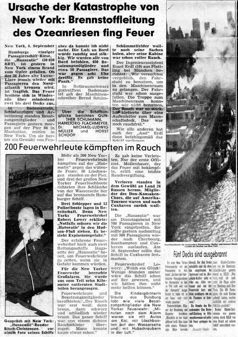 Kurze Zeit später, als ich mit meinen Eltern durch unseren Umzug in unser Haus nach Weihe gezogen sind, und ich dadurch bei der Eisenbahn in Harburg gearbeitet habe, habe ich in einer Zeitung gelesen, dass gerade in diesem Hilfsdieselraum in New York ein Feuer ausgebrochen war, welches das Schiff vernichtete.